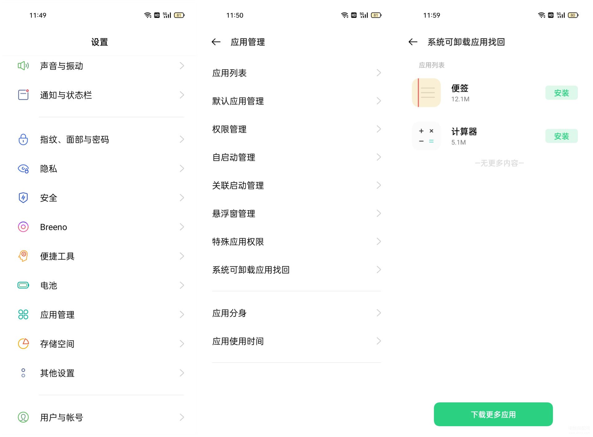 现在虽然基本上人手一台手机,但是完全了解自己手机所有功能的用户应该不多。就举一个简单的例子。如果用户在使用手机过程中,不小心把手机自带的应用删除了怎么办?果粉的话,应该知道可以在AppStore重新下载就OK,那么使用国产手机的用户又该怎么操作呢?方法其实也很简单,就拿我用的OPPO Reno6来打比方吧。它搭载的是ColorOS 11.3系统,OPPO Reno6极具人性化的拥有一个系统应用删除召回功能。操作方式也很简单,打开手机的设置—应用管理—系统可卸载应用找回,即能轻松找回不小心删掉的系统应用。