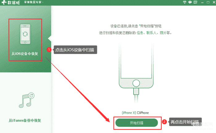 www.shujuwa.net/iphonehuifu/)的电脑上连接手机之后,启动数据蛙苹果恢复专家,选择从iOS设备中恢复,再【开始扫描】。