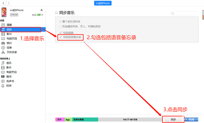 第三步:中部找到【同步音乐】这个选项,同时选择【包括语音备忘录】。最后点击【同步】按钮。