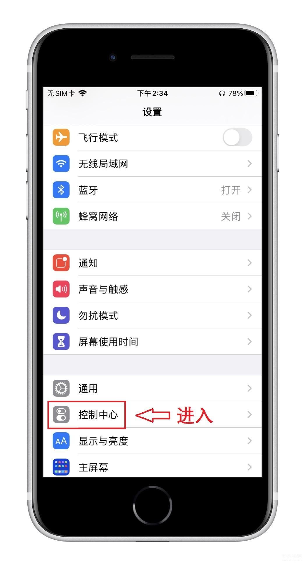 步骤四:如果在控制中心界面没有找到录屏按钮,说明你还没有添加,你需要打开iPhone的【设置】,找到【控制中心】,然后点击进入。