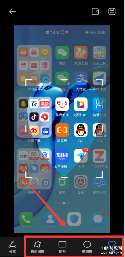 在这个界面的底部,有4种形状按钮:自由图形、矩形、圆形、心形,我们可以根据自己的想法选择就可以了,上图中我选择一个“心形”,所以,屏幕上显示一个“心形”截屏样式,点击右上角的保存按钮,就可以把这个心形截屏保存到手机。
