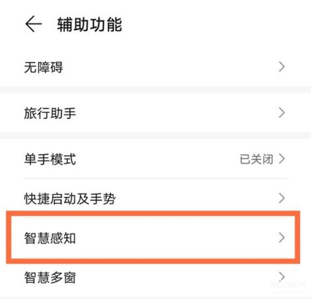 要想使用隔空截屏,也是需要先开启它。打开手机设置,点击“辅助功能”,再点击“智慧感知”。