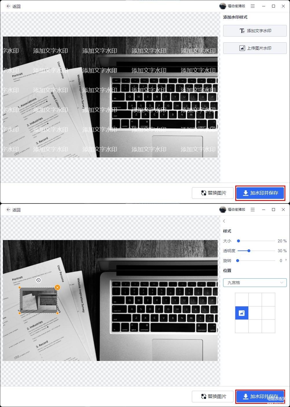 步骤三:水印设置好之后,点击右上角的【加水印并保存】就可以啦!下图分别是“加文字水印”和“加图片水印”的演示图。