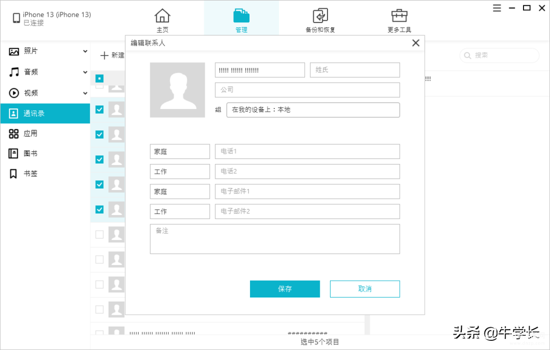 想要批量删除通讯录联系人,那么可以试试专业的牛学长苹果数据管理工具,还支持批量删除照片、备忘录、书签、视频等数据。