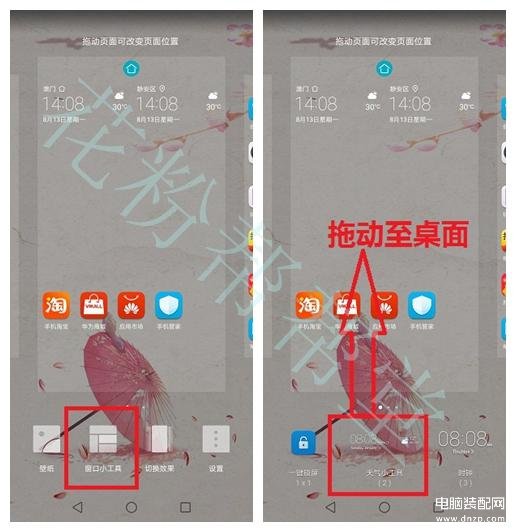 这一节方格主要为一些不知道如何添加插件的朋友说明,知道的粉粉可跳过。我们长按桌面,点击窗口小工具,把天气小工具拖出到桌面即可。