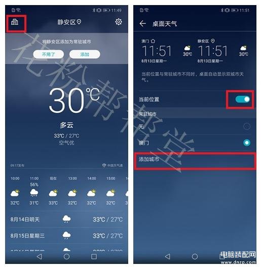 我们进插件后点击城市管理(小房子)——桌面天气——添加城市。