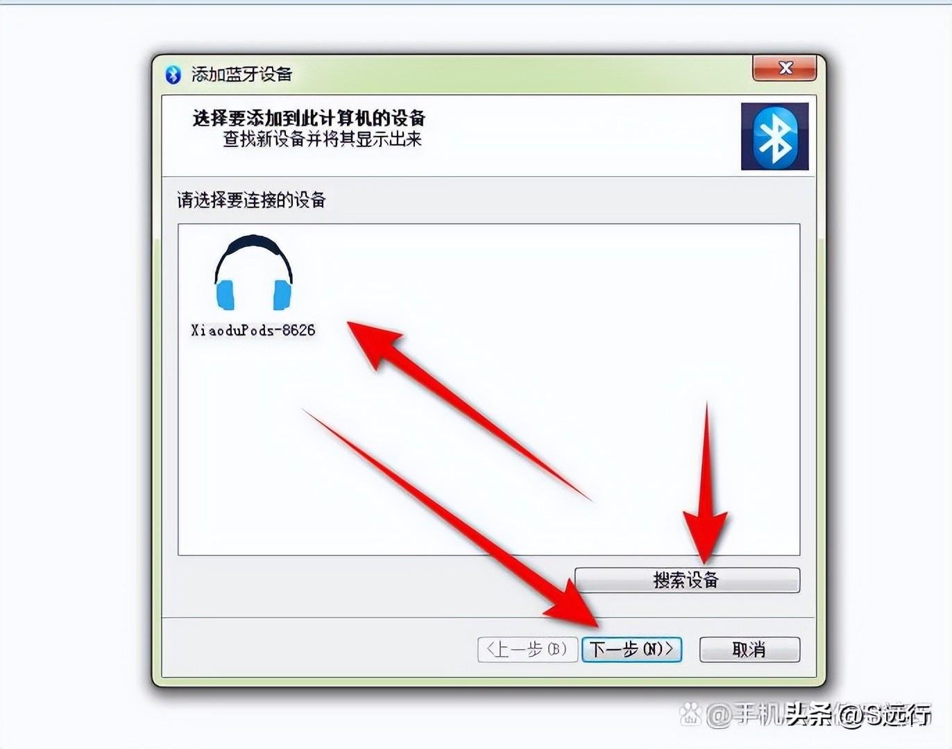 将需要连接的蓝牙设备置于可连接状态,通过单击“搜索设备”即可搜索找到该蓝牙设备,点选需要连接的设备,单击“下一步”。