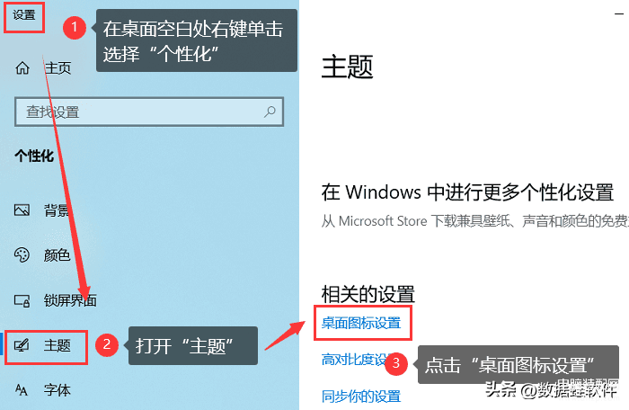 如果桌面图标被删除或移动到其他位置,可以通过以下方法进行恢复。在桌面空白处右键单击,选择【个性化】选项,然后选择【主题】选项,再单击【桌面图标设置】。