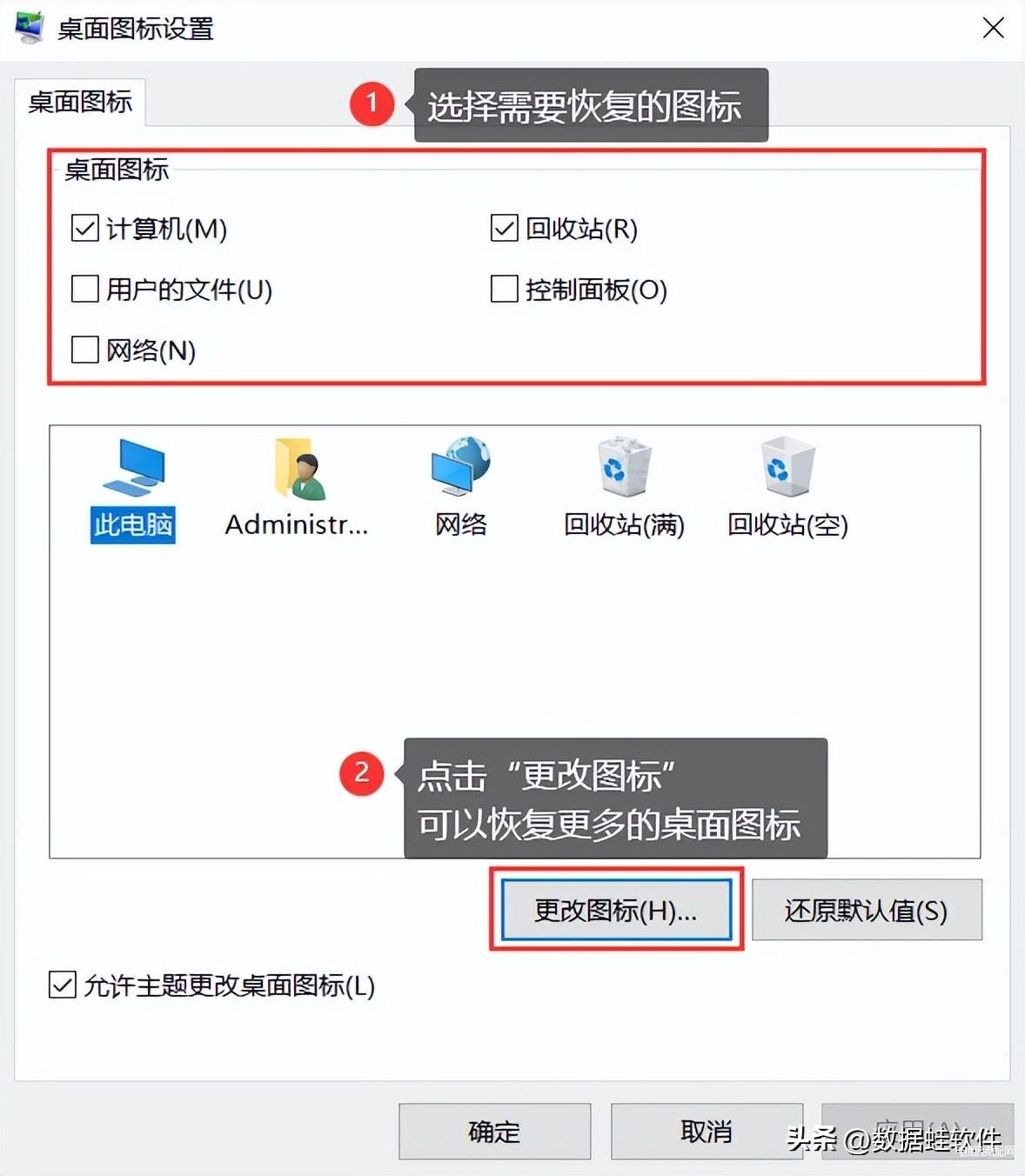 在弹出的【桌面图标】下选择需要恢复的图标,然后单击【确定】按钮即可。如果想要更改图标,就可以点击【更改图标】按钮来设置。