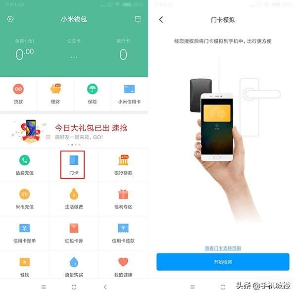 使用方法:点击【小米钱包】-【门卡】-【门卡模拟】-【开始检测】,然后打开手机的NFC功能,将门卡紧贴手机背面NFC天线处进行检测模拟即可。