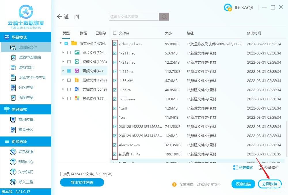 云骑士数据恢复是一款能够全方位解决数据丢失问题的软件,当你不小心误删除文件、清空了回收站亦是格式化了电脑硬盘/u盘/移动硬盘/内存卡等,它都能够轻松帮你找回各种格式的录音文件,如WMA、MP3、WAV、AIFF等,除此之外,恢复图片、视频、文档等文件类型也不在话下,而且软件不含任何插件广告,可放心下载使用。