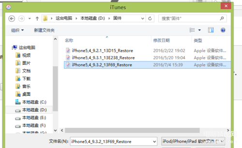 4、这时,按住Shift键,同时用鼠标点击恢复iPhone,在弹出的窗口中选择刚刚下载的固件,点“确定”即可。