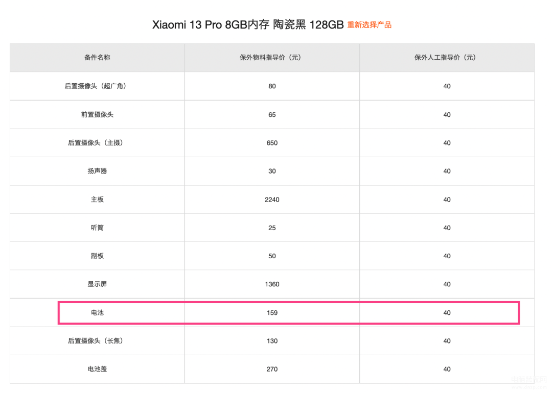 子品牌方面,官网还未显示最新的Redmi K60系列电池更换价格,暂时参考一下发布时间较近的Redmi Note12 Pro+,其电池保外物料指导价159元,保外人工指导价40元。与小米13系列一致。