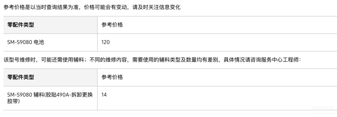 三星方面,官网查询Galaxy S22系列的电池零配件参考价为120元,但同时还需要13~14元的辅料费用,以及100元的人工费。