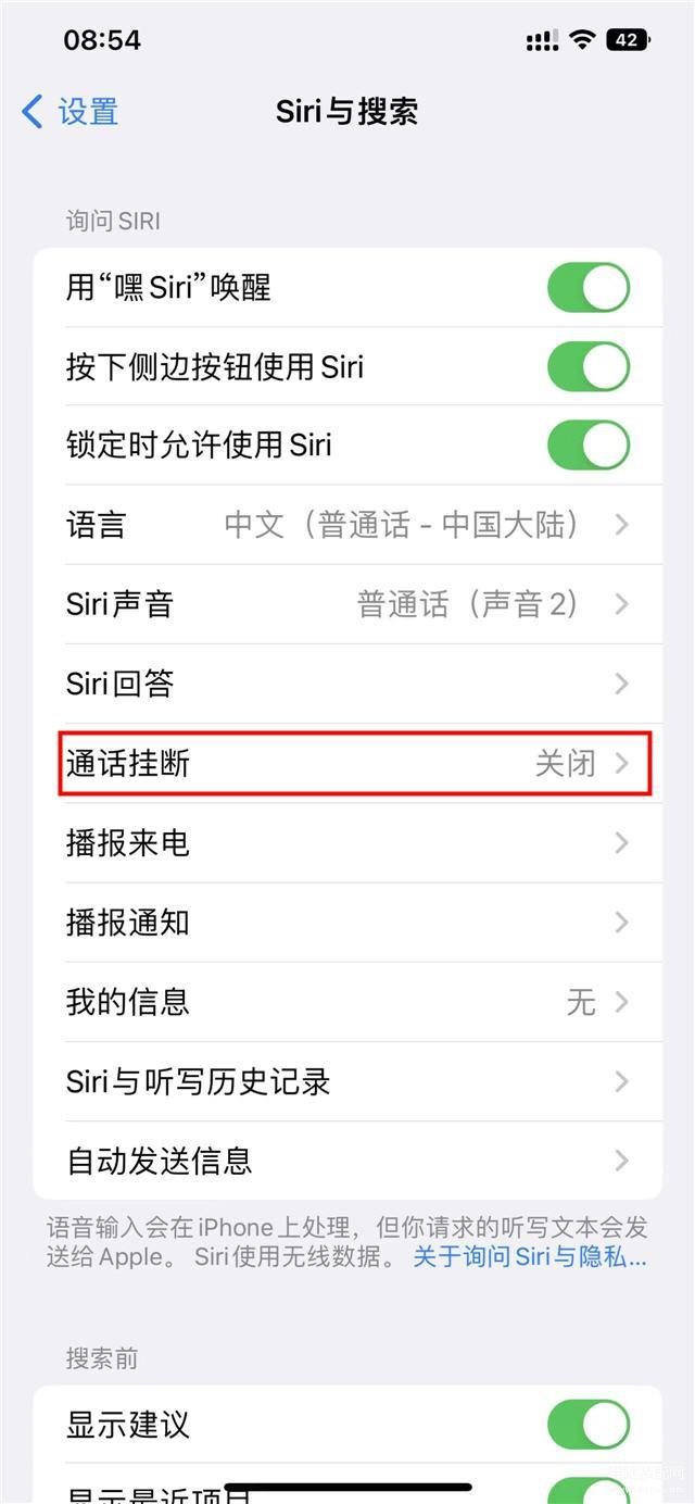2、轻点“Siri与搜索”,下滑并找到“通话挂断”,默认情况下通话挂断开关处于关闭状态。
