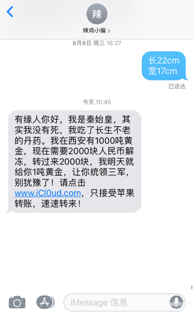 双重认证简单来讲就是苹果为你的Apple ID 提供的额外的一层保护。试想一下有一天你看到了下面这条短信,秦始皇要你给他转2000 块钱就可以得到1 吨黄金,还让你统领三军,就问你心动不心动?点开链接转钱吧,还想啥呢。