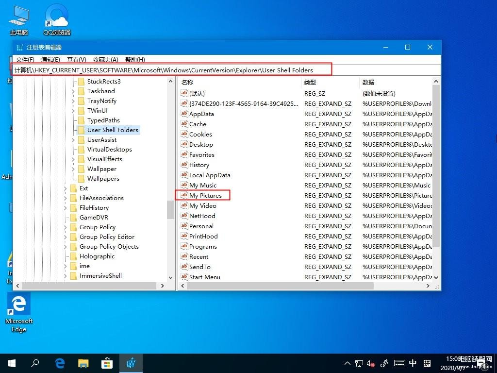 2、在注册表编辑器中,按照“HKEY_CURRENT-USER\Software\Microsoft\Windows\CurrentVersion\Explorer\UserShell Folders”路径依次展开,然后在窗口右侧双击打开“My Picture” ;