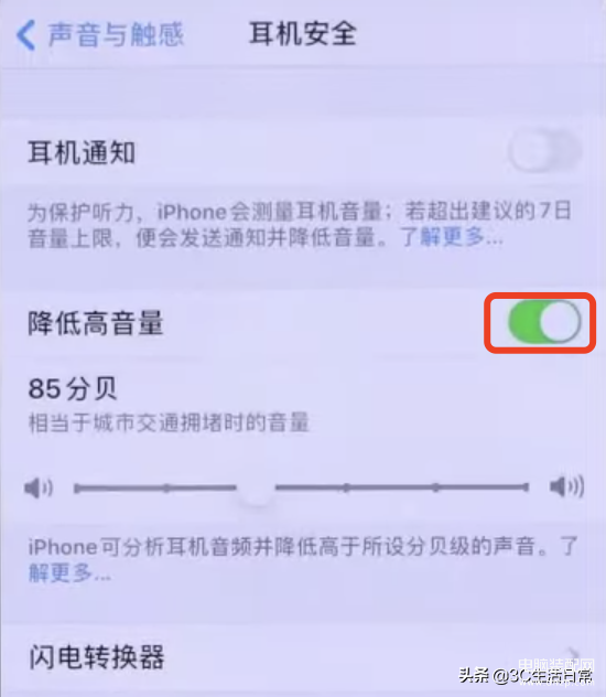 设置-声音和触感-耳机安全,把高音量降低到85分贝,以免使用中突然出现高分贝声音。