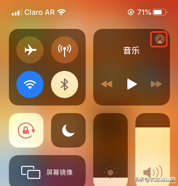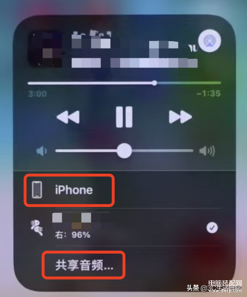点击“共享音频”就可与身边使用的耳机的朋友共享音乐;或点击切换到其他设备如homepod听音乐