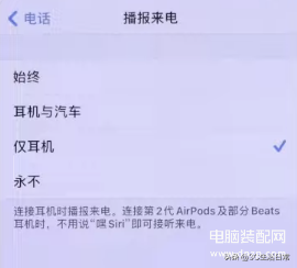 依次打开设置-电话-播报来电,可选择耳机/耳机与汽车
