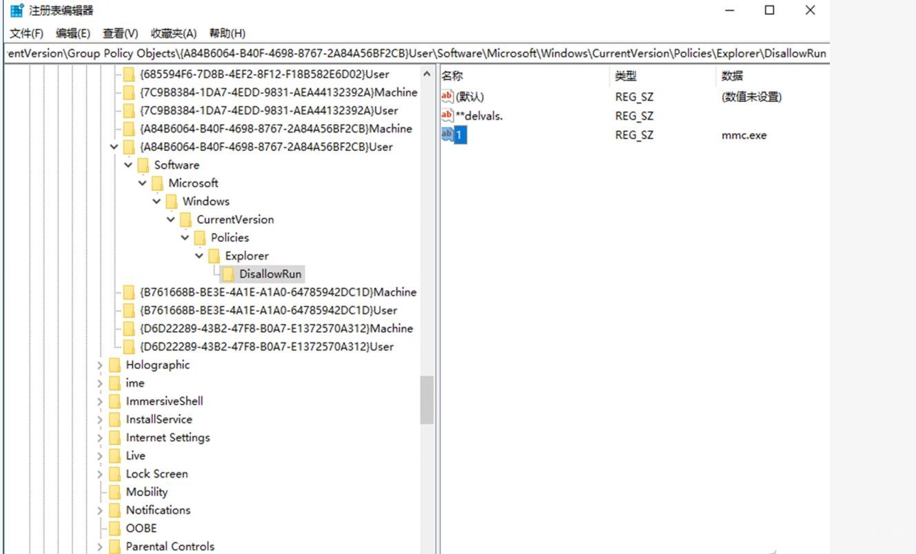 A84B6064-B40F-4698-8767-2A84A56BF2CB}User\Software\Microsoft\Windows\CurrentVersion\Policies\Explorer\DisallowRun],删除右侧数据为“mmc.exe”的字符串值,重启后就可以运行mmc.exe加载组策略进行修改了(图3)。