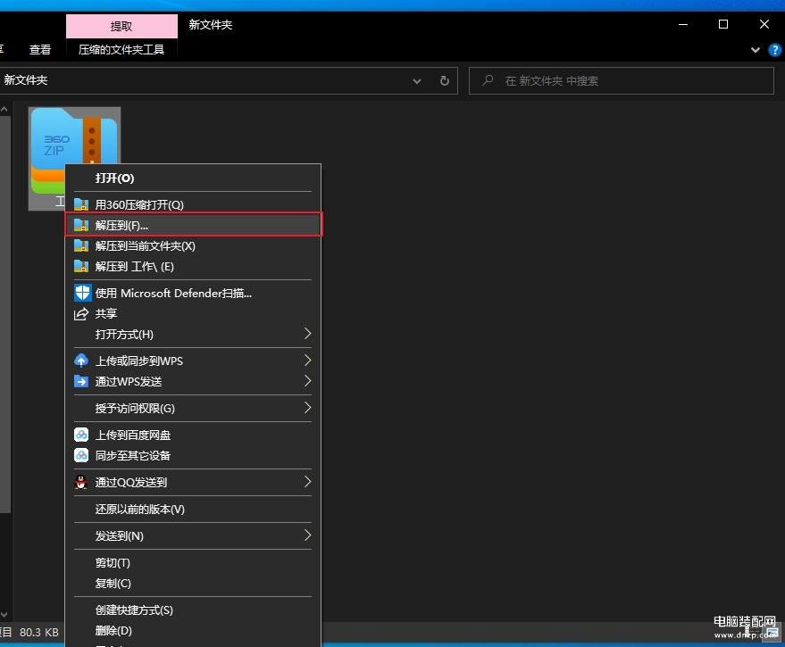 第一步:打开准备解压缩的文件所在的文件夹。使用鼠标右键单击压缩文件图标,在弹出的快捷菜单中选择【解压到】菜单项。