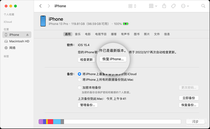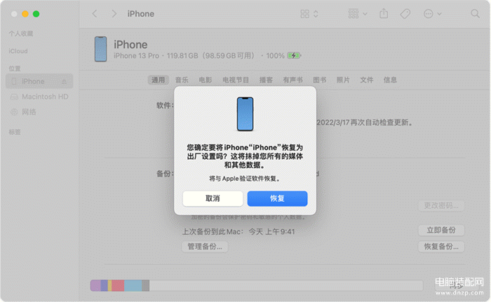 再次点击【恢复】按钮进行确认。你的电脑将抹掉设备上的所有内容并安装最新的iOS系统。