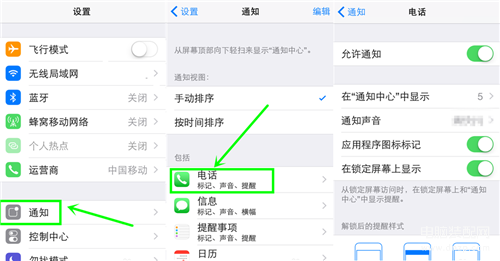 4、进入【设置】-【通知】-【电话】,将所有按钮开关打开。试试有没有铃声了~