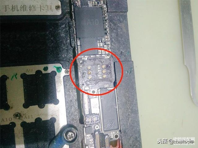 拆机,拆下屏幕,取出主板,该机之前有修过,是二修机,SIM卡槽是换过的,并且还有一点歪。