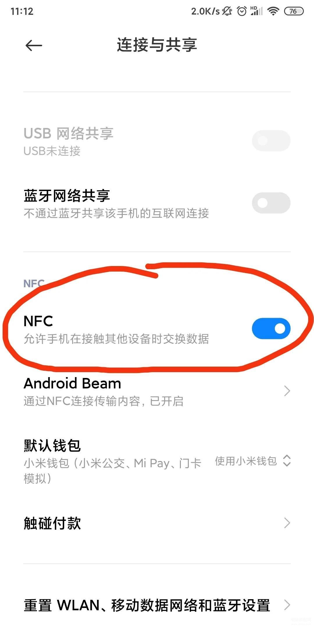 2.找到NFC选项,然后打开NFC功能。