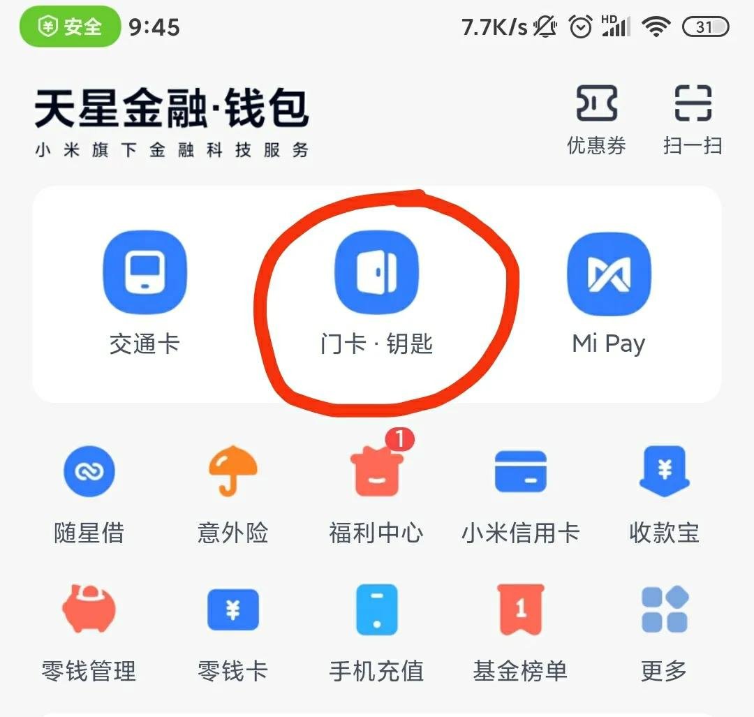 4.如上图,找到钱包app里门卡·钥匙,点进去。