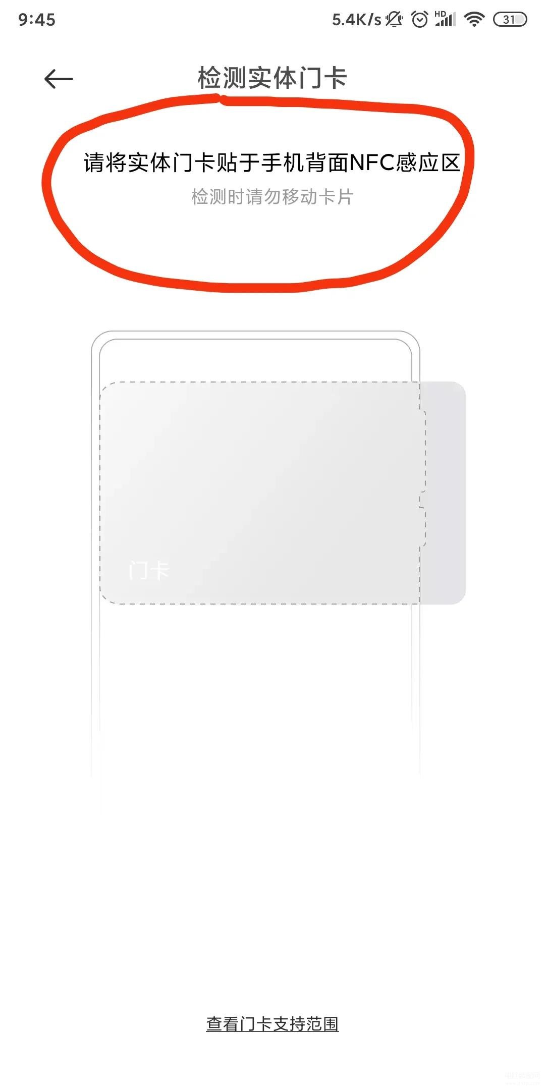 6.安照提示将门禁卡紧贴手机背面的NFC感应区等待复制完成。注意:大部分人为保护手机装有手机壳,如果识别不到门禁卡,可将手机壳去掉之后,尝试一下。