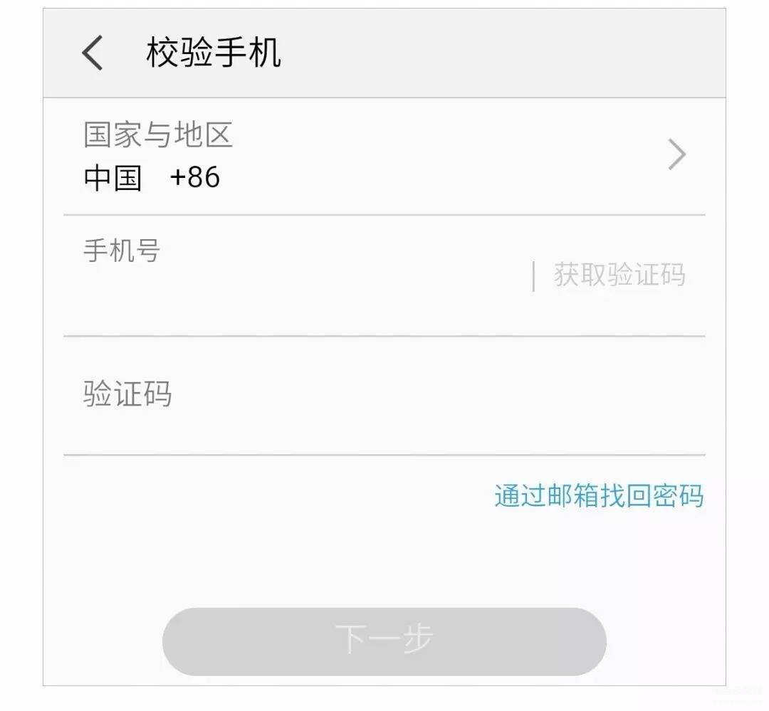 接下来会根据账号绑定的是手机号码还是安全邮箱,对手机或邮箱进行验证,既绑定了手机又绑定了邮箱,会默认验证手机号码,在下方右侧可以切换为「通过邮箱找回密码」。