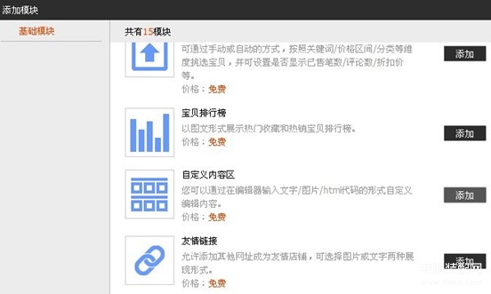 1、打开店铺装修页面,加入我们要将店铺收藏图片放在首页的左侧栏。我们先登录店铺装修页面:我是卖家--店铺管理--店铺装修,将鼠标随便移动到左侧栏的任意模块,点击模块右下角出现的【+添加模块】,如图: