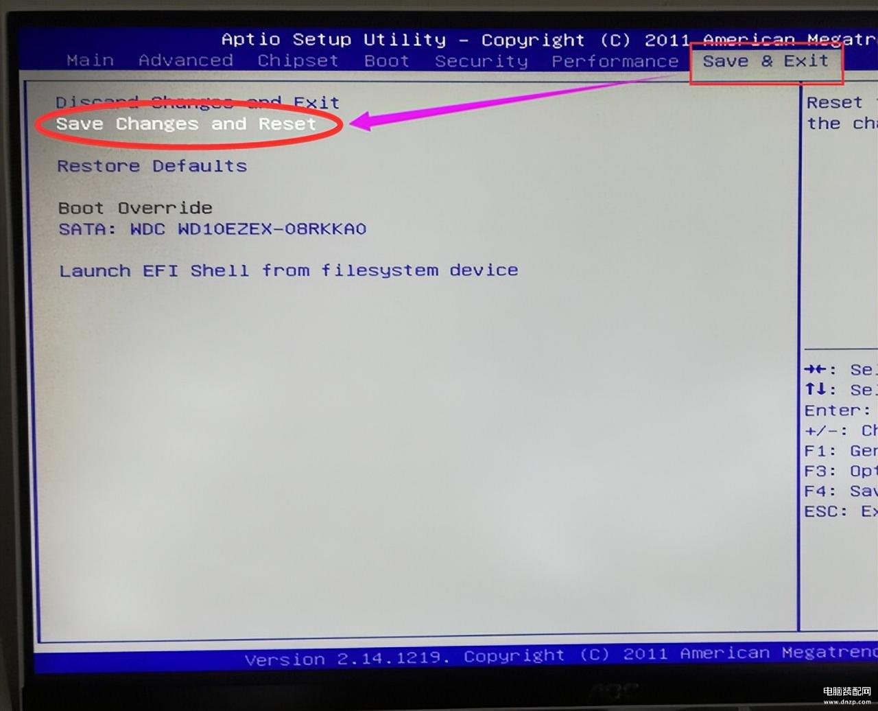 (6)最后回到BIOS主界面后,再用键盘上的方向箭头键,向右选择"Save&Exit"选项,再向下选中“Save Changes and Reset”后,按下回车键保存退出重启电脑即可。