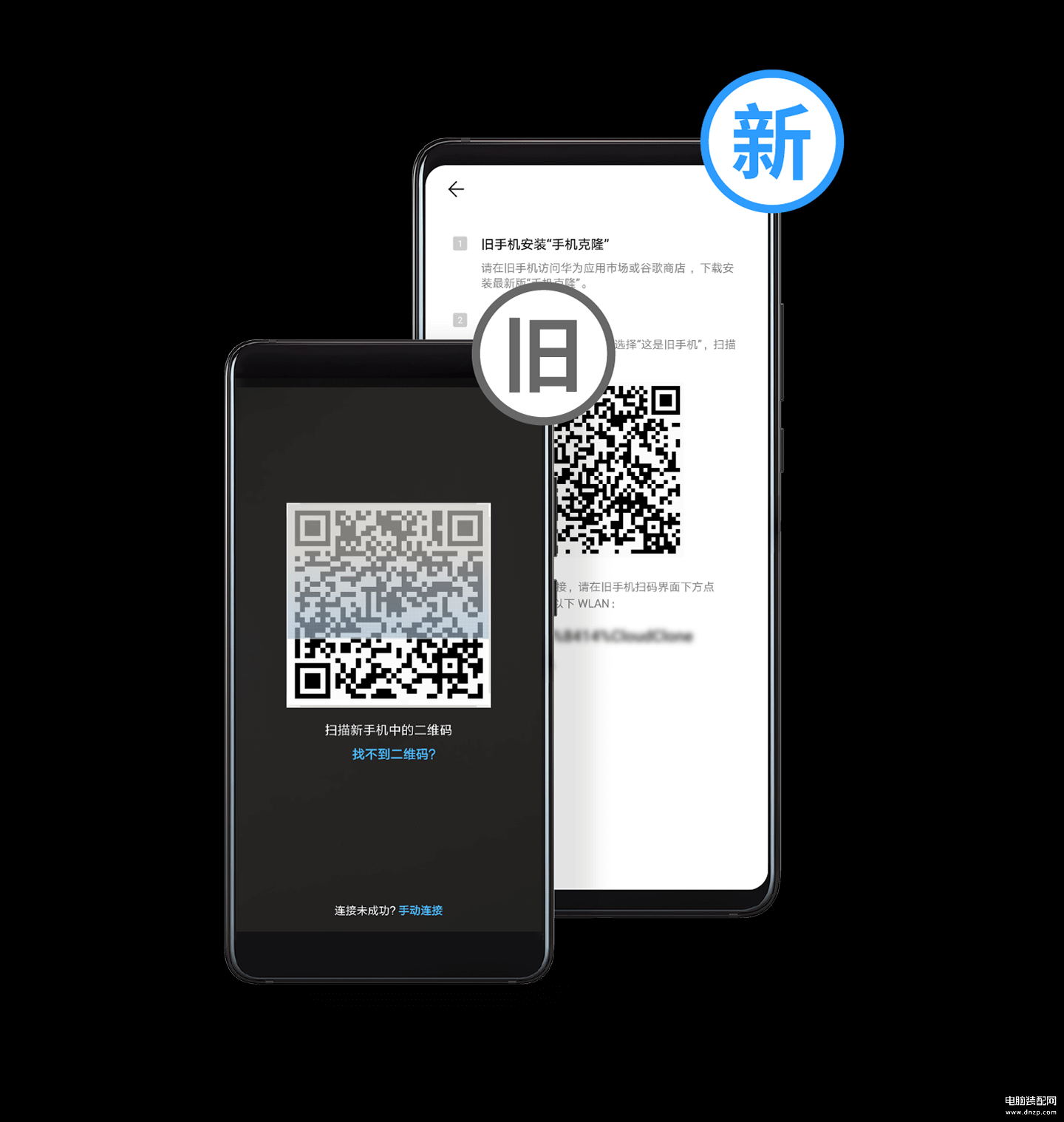 2. 用旧手机扫描新手机上的二维码,建立连接。还可以选择手动连接:旧手机在设置>无线局域网中,连接新手机本地热点,建立连接。