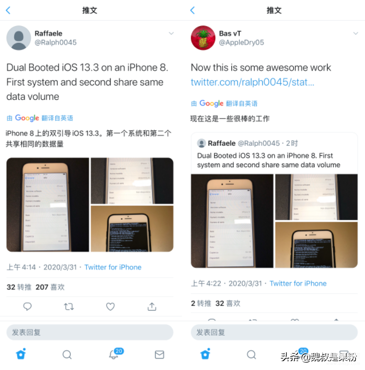 今天又有一位牛人分享自己的杰作,推特名:Raffaele,这位作者使 iPhone 8 设备实现双引导操作,可以同时使用二个系统切换,分别为 iOS 13.3 和 iOS 13.3.1 系统。