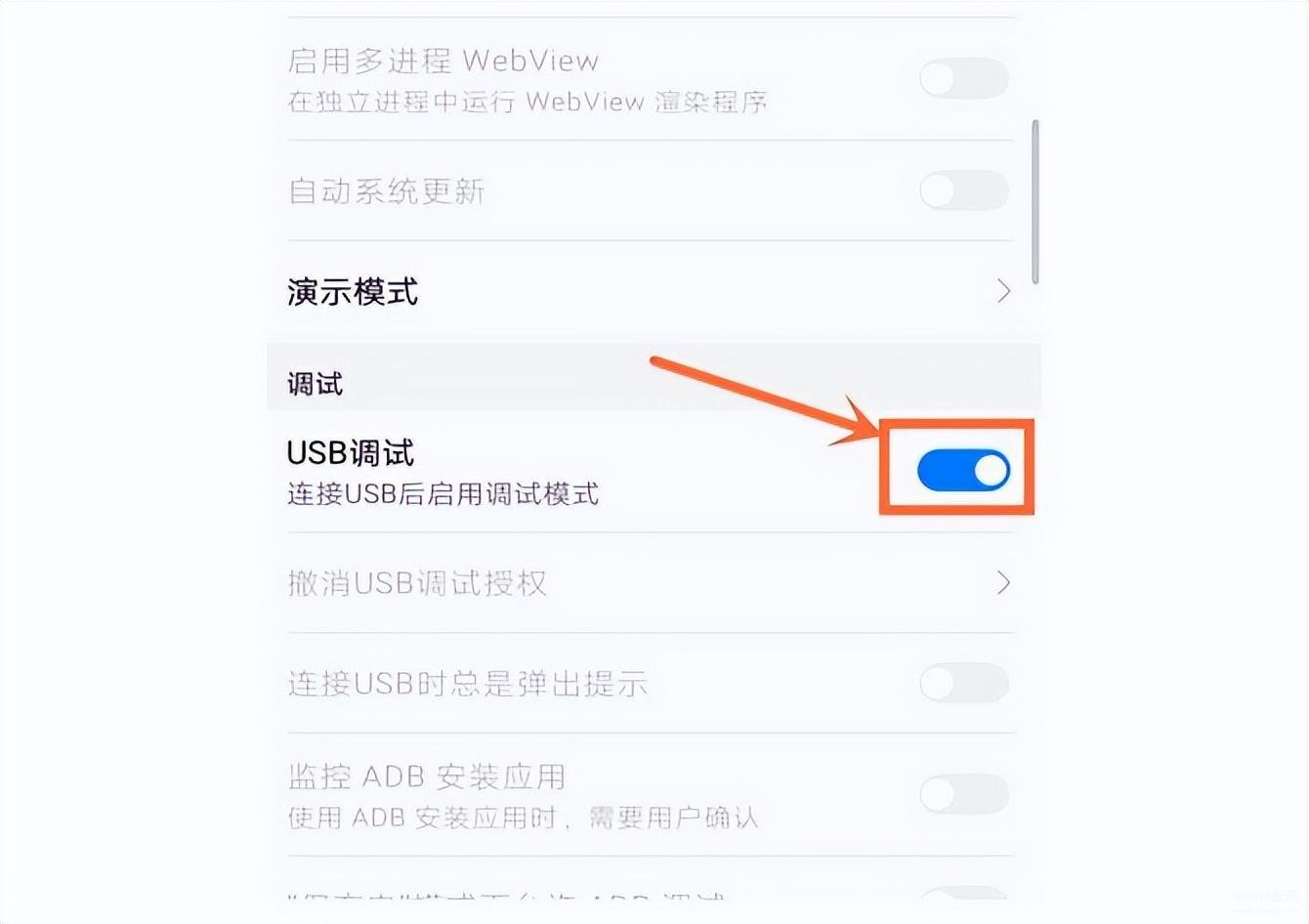 6、选择把USB调试”右侧的“开关”按钮点击打开,就可以开启手机USB调试了