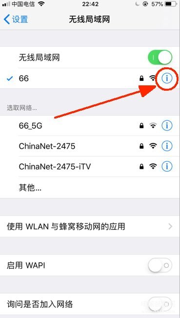 3、在WIFI名称左边 点开 i 图标 如图所示
