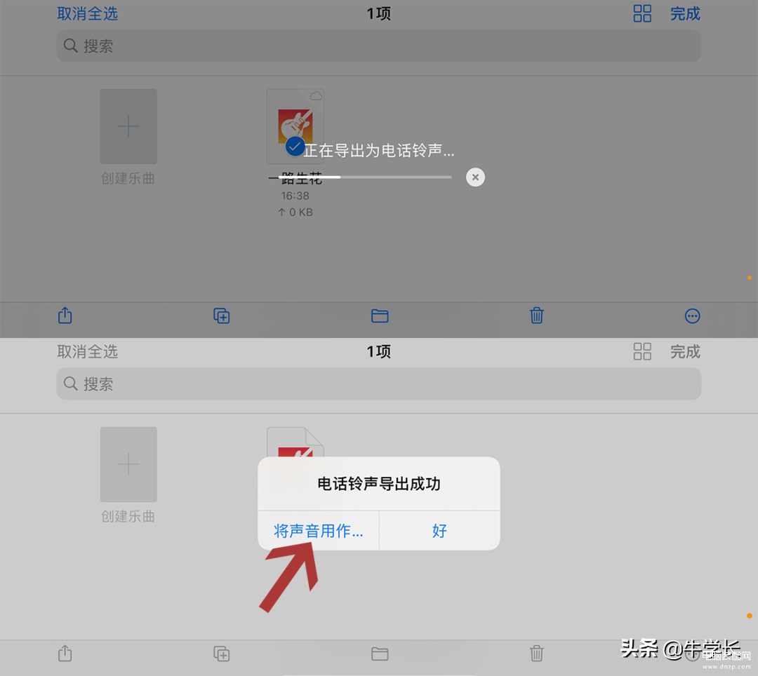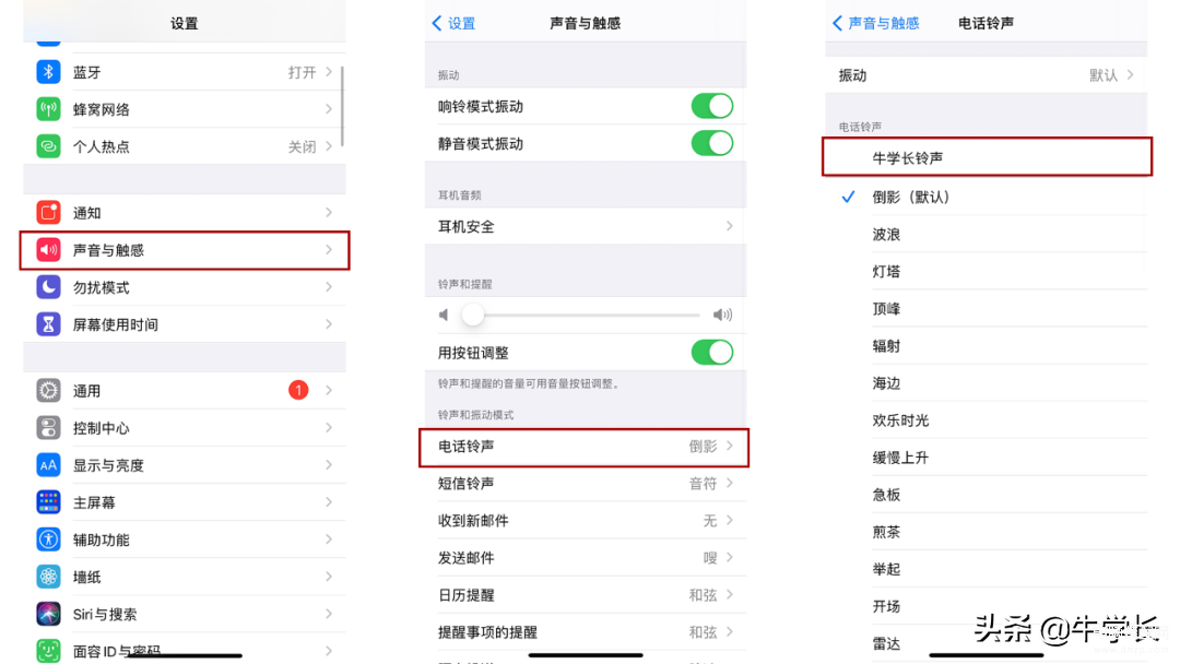 步骤5:错过了在铃声导出成功提示框中的快速设定铃声,只需点开【设置】-【声音与触感】-【电话铃声】