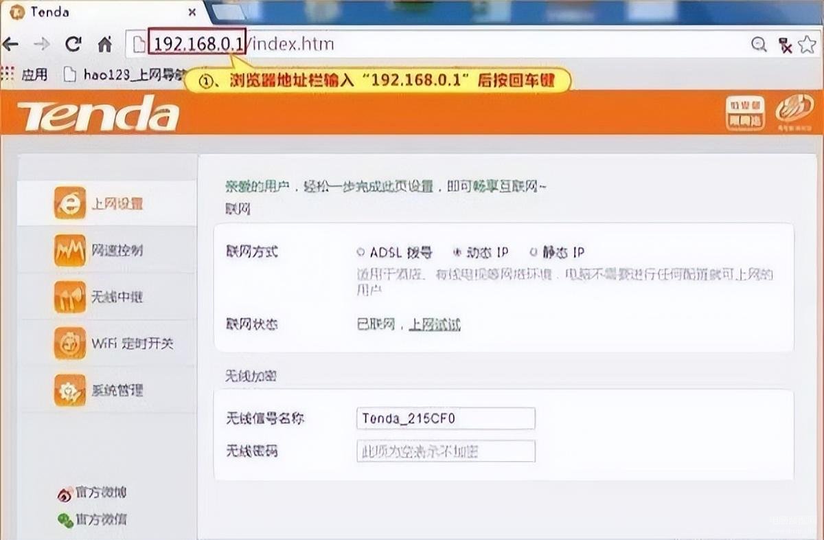 在浏览器地址栏输入192.168.1.1或192.168.0.1(具体地址可以看路由器的背面,上面标注有地址)回车进入管理界面。