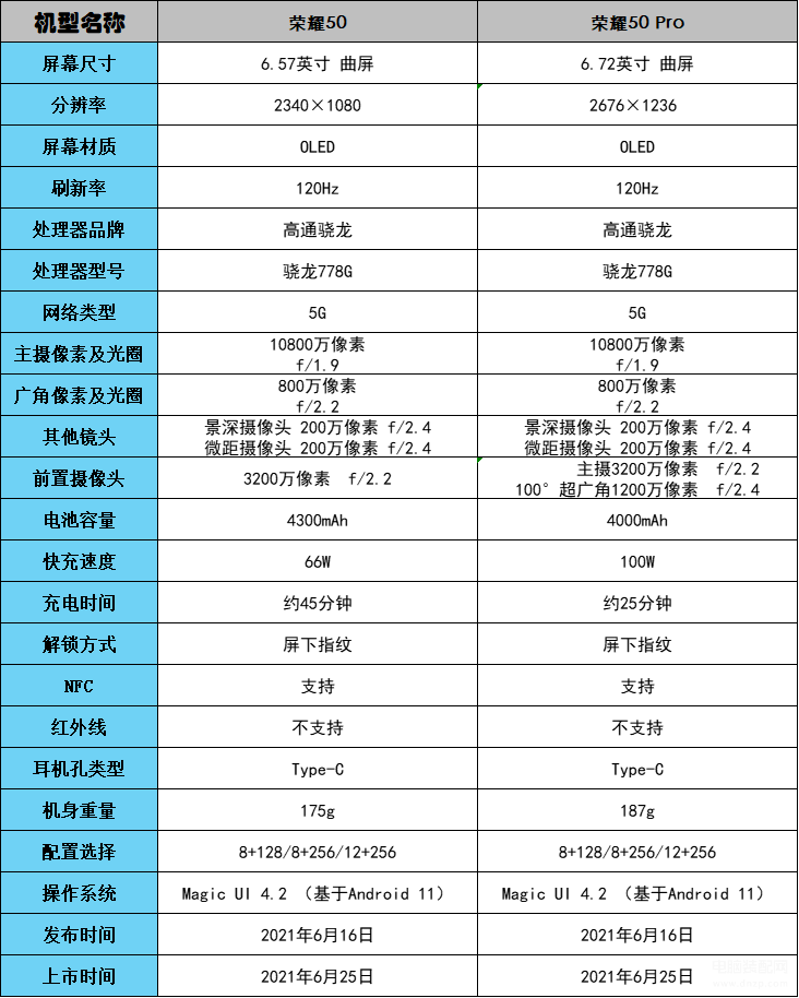 最后放一下荣耀50与荣耀50 Pro的参数对比图供大家参考。
