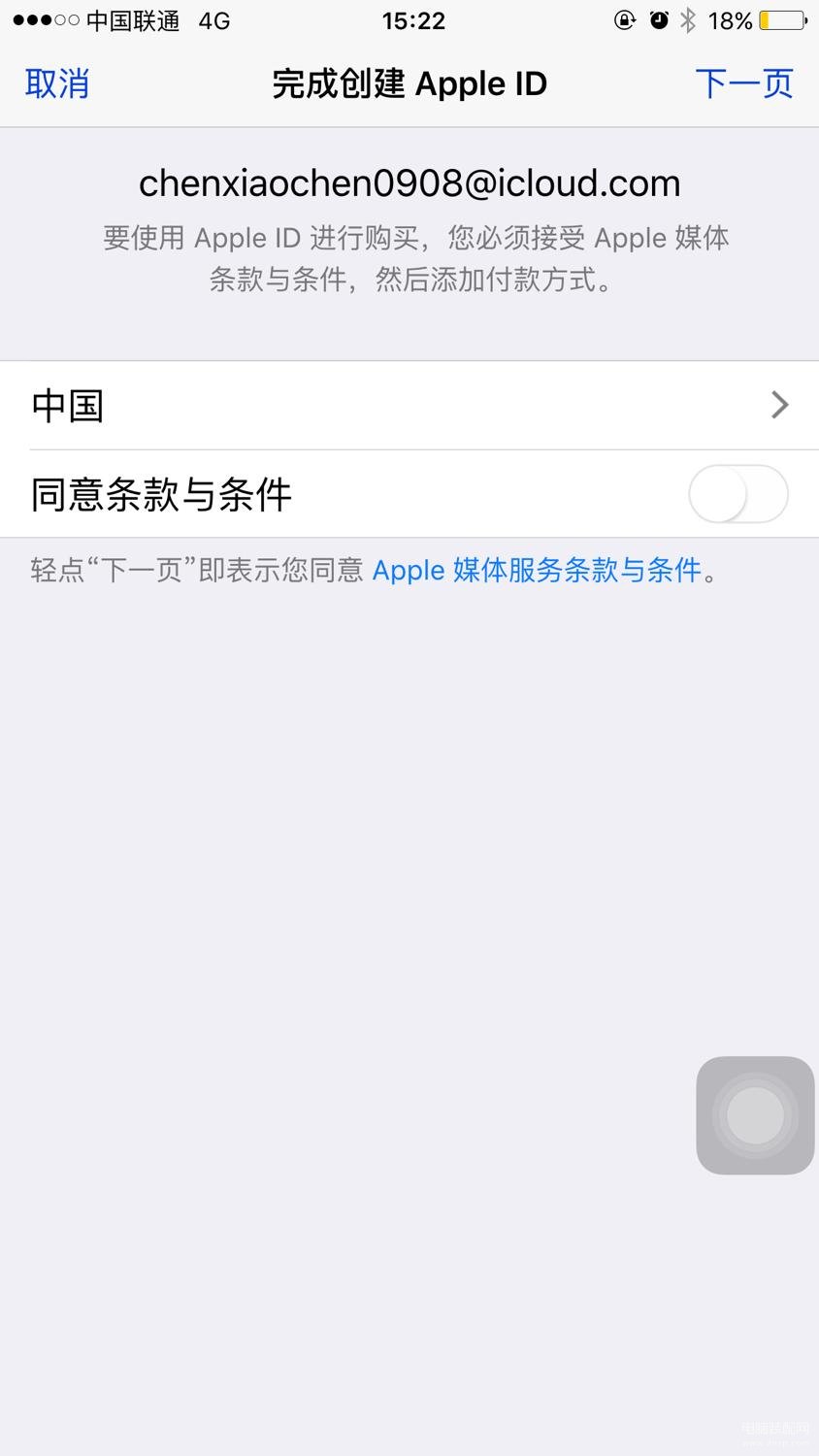 同意条款与条件后边按钮变为绿色为打开,点击右上角的下一页