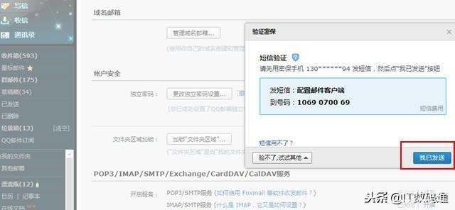 三、点击开启之后系统会弹出一个验证密保,要求你按照要求给QQ邮箱绑定的手机号发送指令来开启,我们只需在iPhone手机发偶送短信即可,但iPhone手机必须是使用绑定QQ邮箱的手机号,发送之后点击【我已发送】按钮,如下图所示。