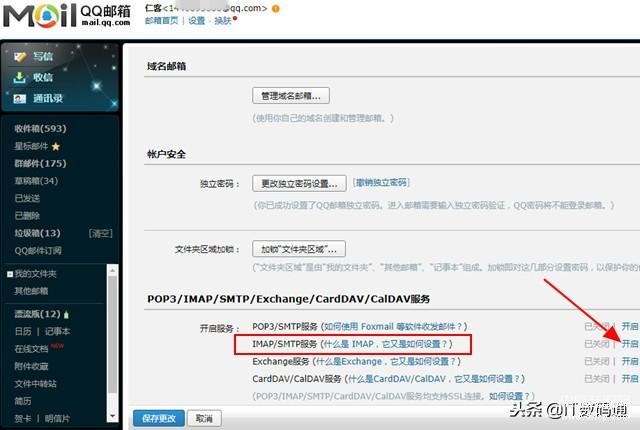 二、然后在设置主界面下方切换至【账户】选项卡,我们在账户选项卡界面下方看到一个【服务】,其中就有一个IMAP/SMTP服务,默认情况下是关闭的,我们在它的右侧点击【开启】即可,如下图所示。