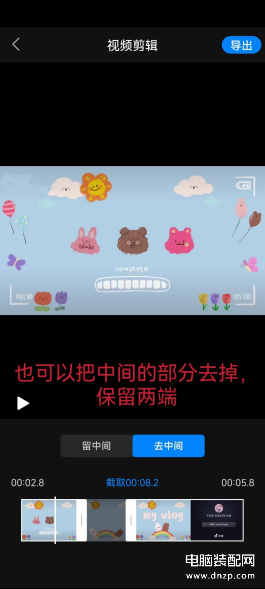 3、下图展示的是【去中间】的剪辑效果展示,若是视频冗余的部分在中间,我们就可以采取此种剪辑方式,保留两端。而且可以把视频剪辑细节精确到0.1秒。