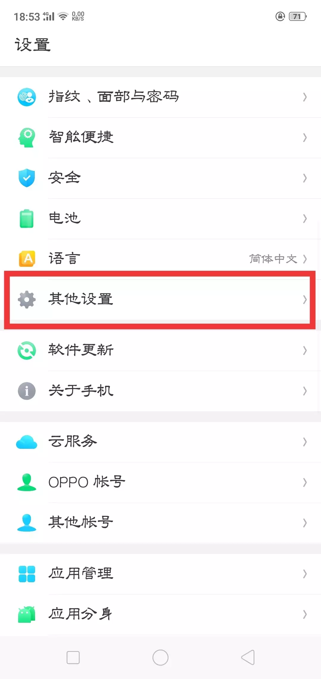 进入设置—其他设置—备份与恢复—新建备份—备份(ColorOs 5.0以前的版本,在工具—备份与恢复—新建备份—备份)选择完成后拷贝至其他存储设备保存;
