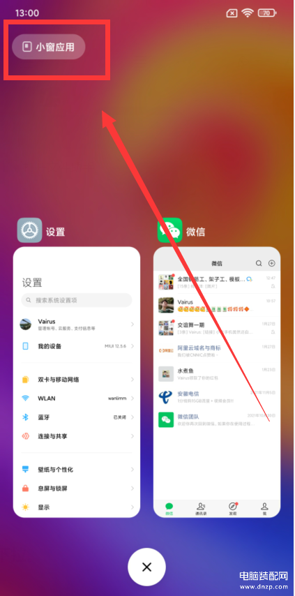 在这个界面的左上角,有一个“小窗应用”按钮(如上图),点击这个按钮,就会显示所有能小窗口的应用软件(如下图),可能左右滑动查看更加应用。