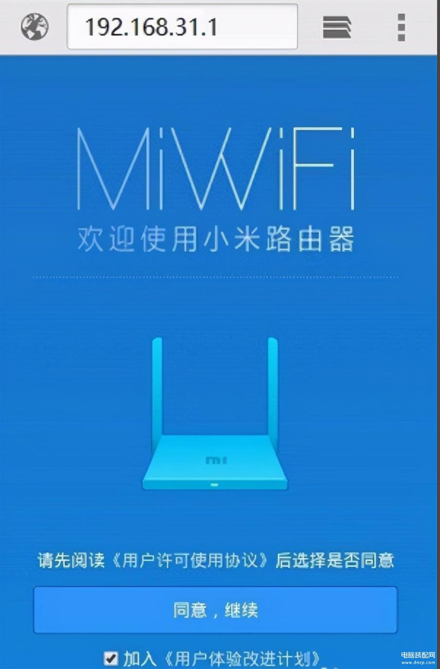 2、打开手机或电脑上的浏览器,在地址栏输入miwifi.com或192.168.31.1,进入到首页,点击同意进入到下一步配置。