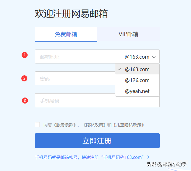 https://mail.163.com/register/index.htm?from=163mail,选择需要注册的邮箱类型(如:163.com、126.com、yeah.net),依次填写“邮箱地址”、“密码”、“手机号”,点击“立即注册”即可(如下图所示);